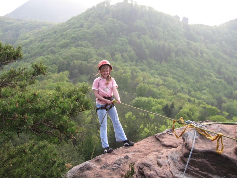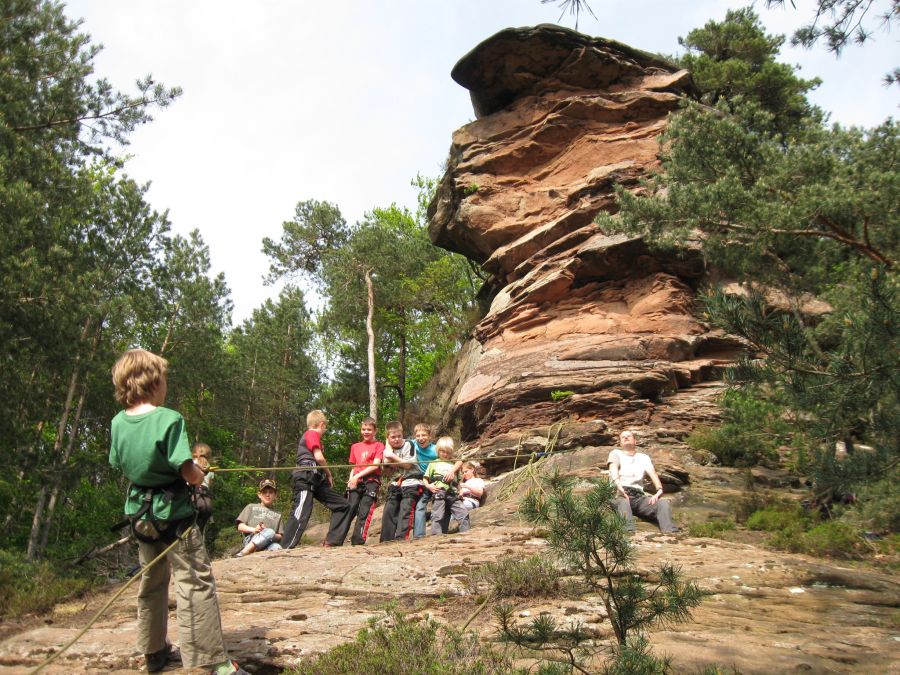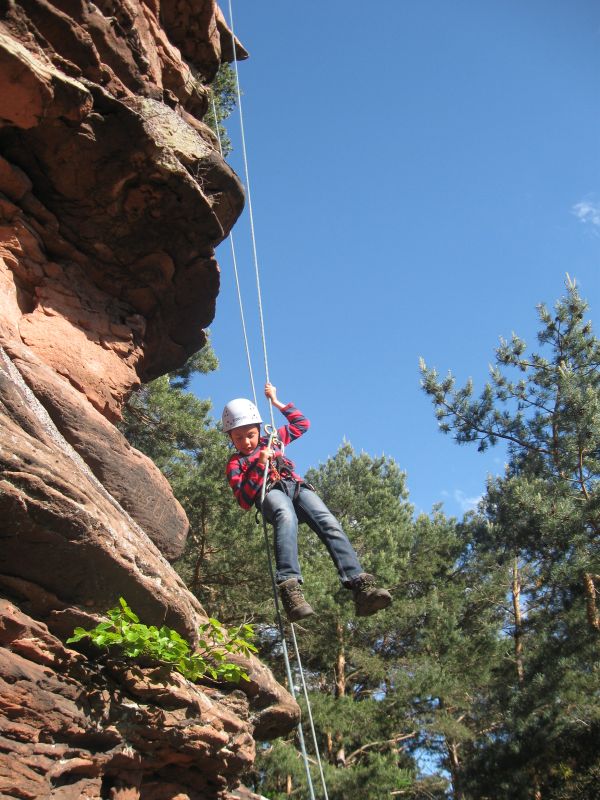 Wie mag sie sich wohl fühlen, die Spinne, wenn sie an ihrem Faden hängt? Ihr könnt es selbst ausprobieren! Bestens gesichert geht es vom Felsplateau abwärts – in die Tiefe. Dabei könnt ihr euch mal die mächtige Felswand ganz aus der Nähe anschauen. Tipp: Nach der Abseilaktion könnt ihr, wenn ihr wollt, noch die nahegelegene Burg erkunden.